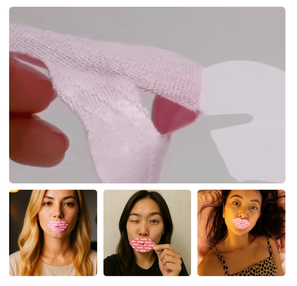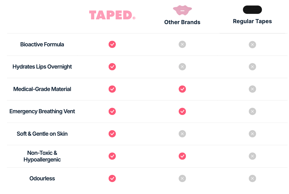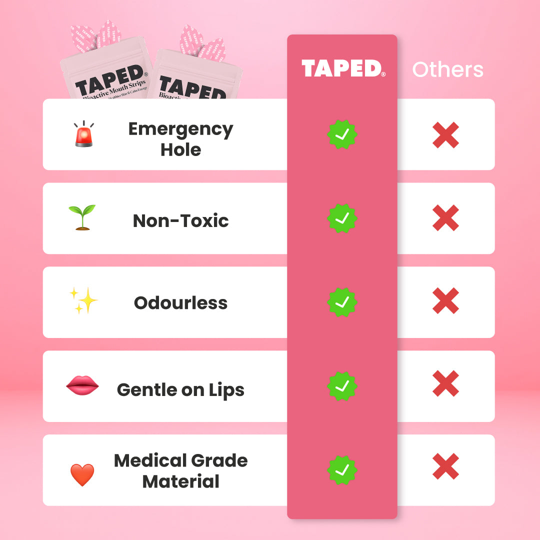 By gently holding your lips closed during sleep, TAPED trains your body to breathe through your nose instead of your mouth. This simple shift reduces snoring, prevents dry mouth, and helps you reach deeper, more restful sleep by increasing oxygen intake and calming your nervous system.